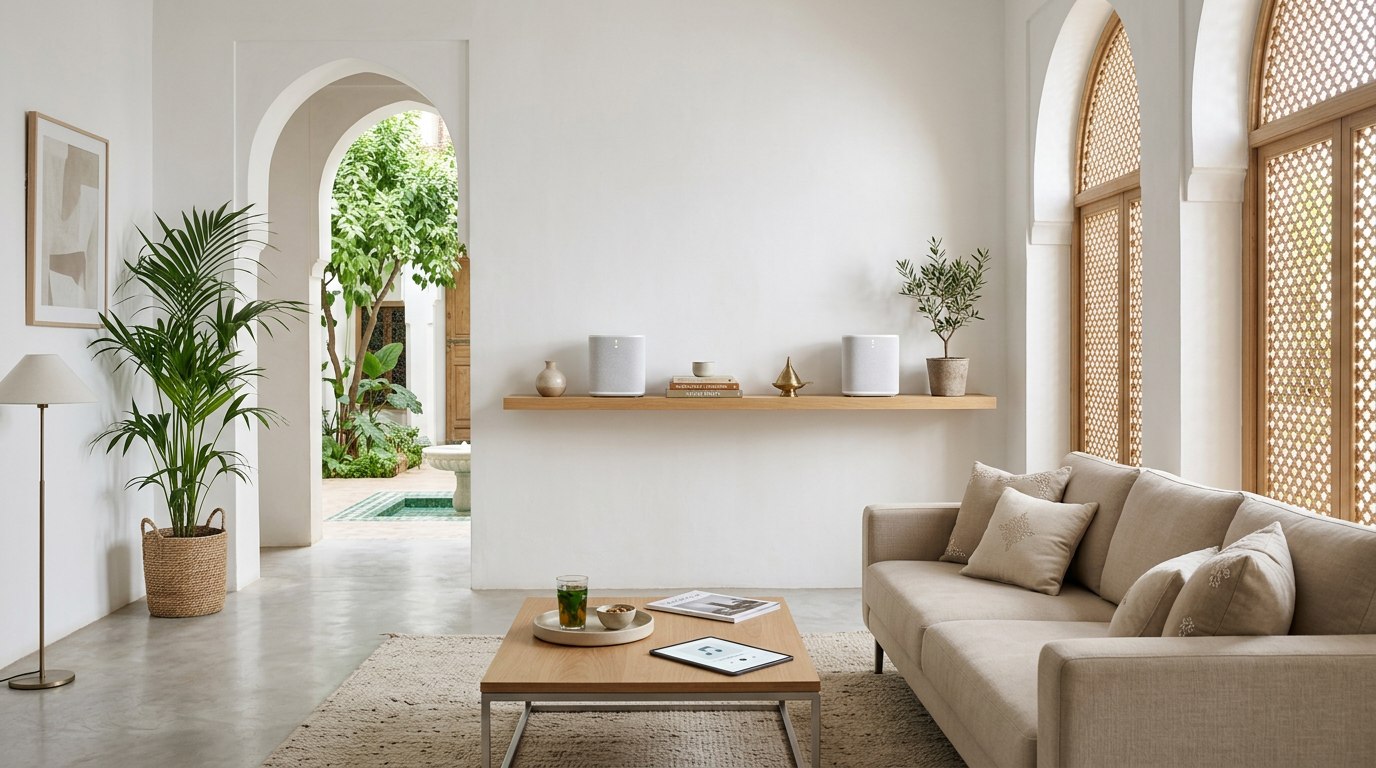 Comment concevoir un système audio multiroom pour une villa de luxe au Maroc ? Sonos pour le streaming, B&W pour le son, Loxone pour l'automatisation. Guide complet avec plans de zones et budgets.