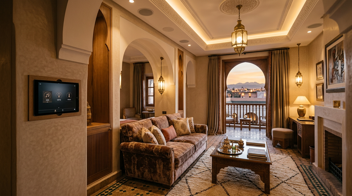 Comment transformer un hôtel ou riad marocain avec l'audio multiroom et la domotique ? Sonos en chambre, Loxone pour la gestion énergie, Horion en lobby. Solutions, ROI et retour d'expérience.